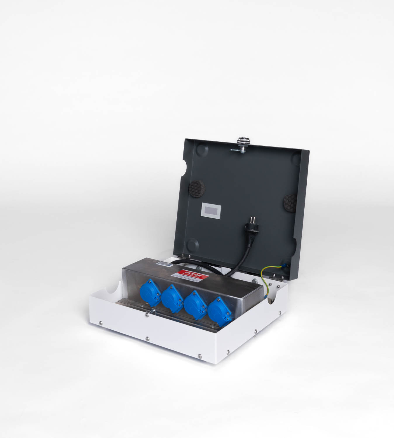 Die Energiebox ist mit einem geeichten Zähler ausgestattet. Außerdem kann die Energiebox mit einem Zahlenschloss verriegelt werden. Es können vier Geräte gleichzeitig ausgeschlossen werden. (4 x 230V Schukosteckdose)